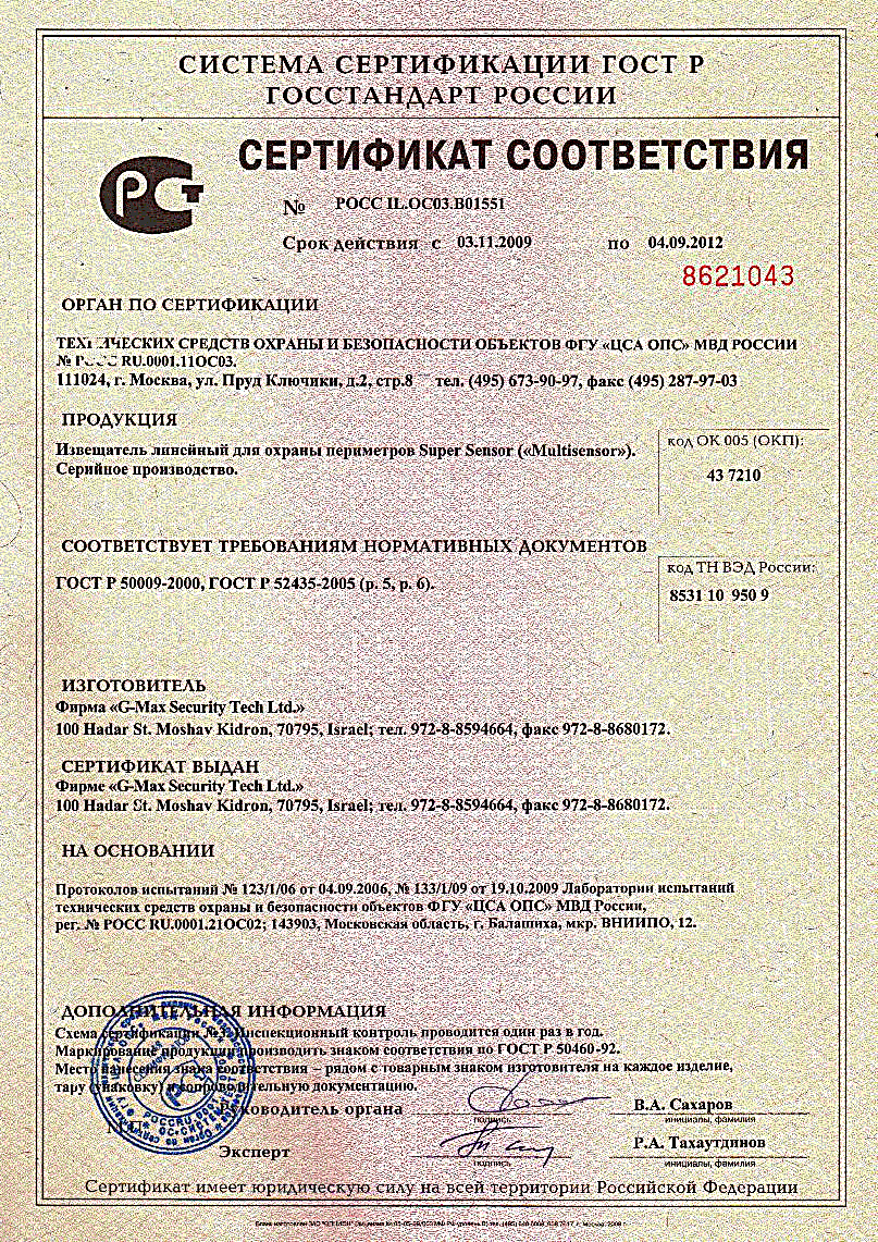 Извещатель линейный для охраны периметров Super Sensor ("Multisensor"). Сертификат соответствия